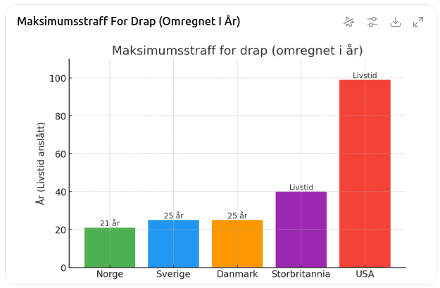 Maks fengselsstraff (ordinær) | 21 år | Livstid (kan prøveløslates etter 18–25 år) | Livstid (kan prøveløslates etter 12–16 år) | Livstid (ofte uten prøveløslatelse) | Livstid eller dødsstraff i enkelte stater |