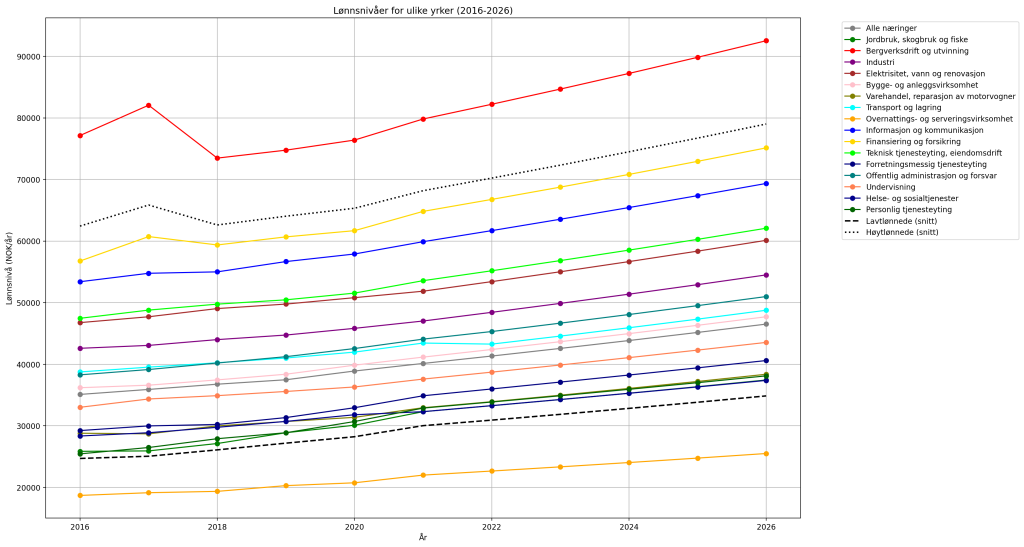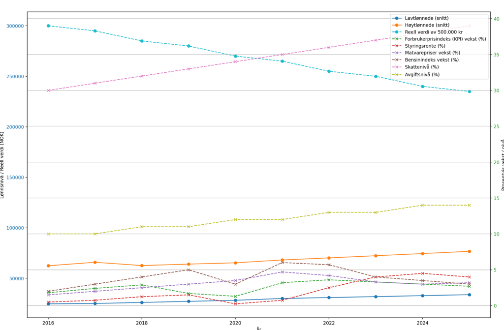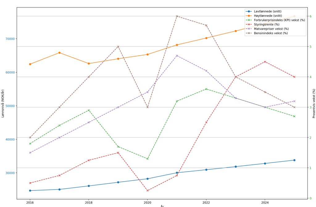 Så viser vi utviklingen på snitt lønn for lavt- og høyt-lønnende, og så tar vi med oss Norges-bank rente, pris konsumer indexen, matvare, drivstoff,