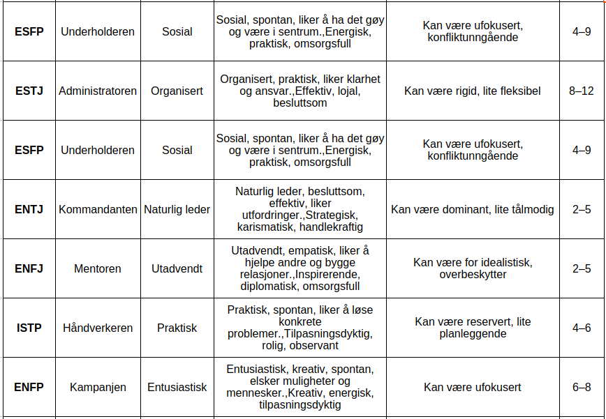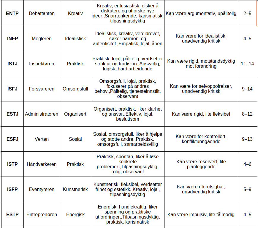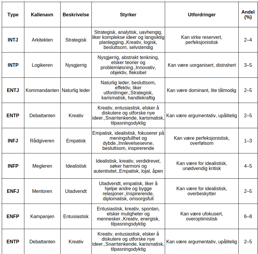 Her er en oversiktlig tabell over de 16 MBTI-personlighetstypene, med en kort beskrivelse, typiske styrker, potensielle utfordringer og omtrentlig andel i befolkningen. Tallene for andel er basert på globale estimater og kan variere noe mellom kilder. Oversikt over MBTI-personlighetstyper