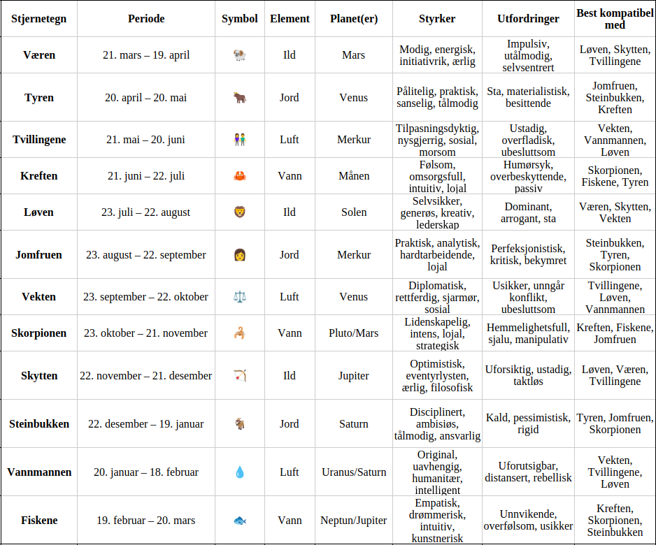 Her er en utvidet tabell for de vestlige stjernetegnene (Zodiak), med symbol, element, planet, styrker, utfordringer og kompatibilitet – for en dypere forståelse: